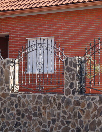 Finalmente fabricamos e instalamos vallas en hierro forjado o vallas de forja, con barrotes macizos tanto lisos como salomónicos, con adornos de hierro fundido o bien con pletina maciza. Pueden ser en arco o en recto, con o sin puntas de lanza (el cliente deberá informarse si en su municipio están o no permitidas las puntas de lanza); son vallas de aspecto regio, elegantes, y muy, muy bonitas.